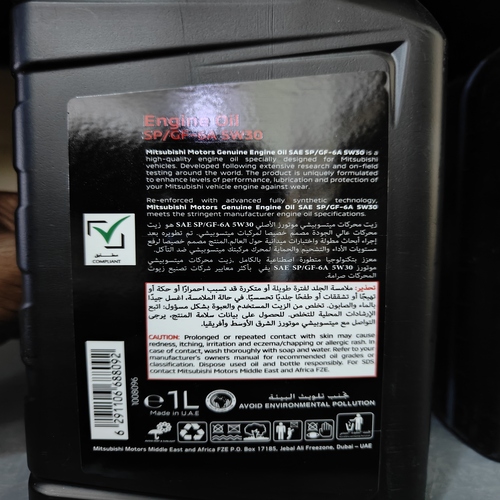 The Mitsubishi Motors Genuine Engine Oil SAE SP/GF-6A 5W-30 is a high-performance, fully synthetic engine lubricant engineered specifically for Mitsubishi vehicles. This genuine product is produced under strict quality supervision and is designed to deliver manufacturer-approved lubrication, enhanced engine protection, and consistent reliability during daily and long-distance driving. Developed through extensive global research and field testing, this oil meets Mitsubishi’s demanding standards for durability, fuel efficiency, cleanliness, and engine longevity. It is crafted to ensure that every Mitsubishi engine receives the exact level of care and performance that the manufacturer intended.